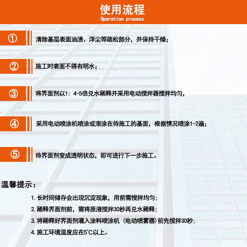 Il convient au prétraitement de l’interface de base du béton, du béton cellulaire, des petits blocs, des cloisons légères, des murs en brique-béton, du grattage de mastic, du collage de carreaux, du revêtement arrière de maçonnerie et des panneaux d’isolation thermique.