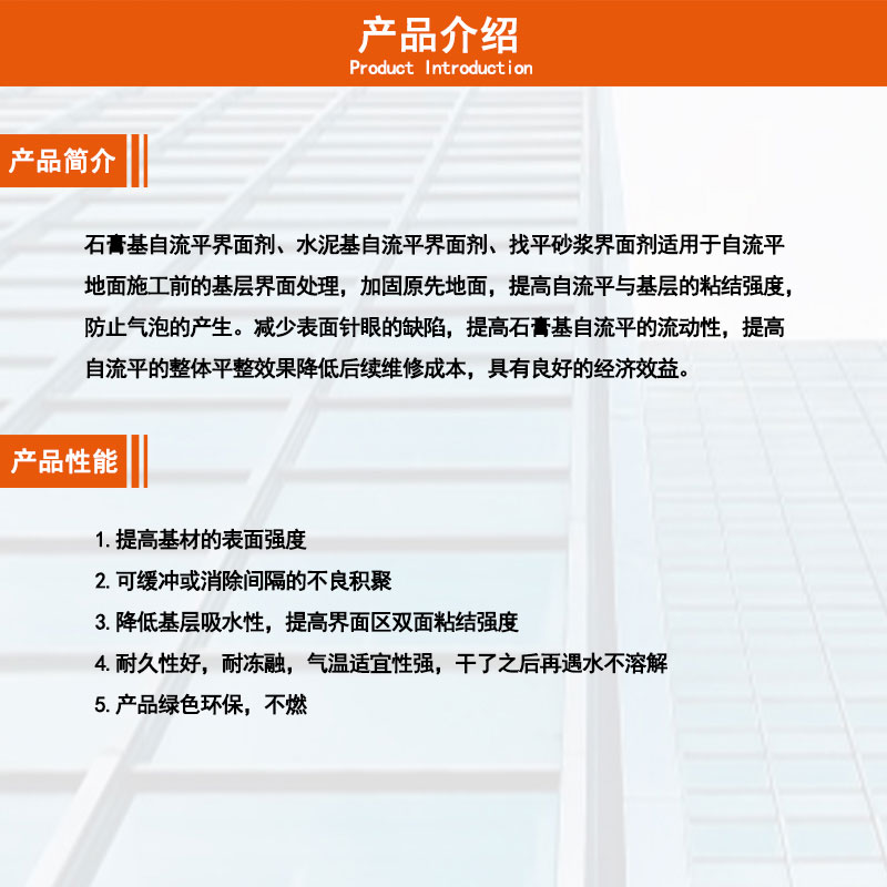 L’agent d’interface autonivelant à base de gypse a une bonne fluidité et peut pénétrer rapidement dans la surface des revêtements de sol autonivelants à base de gypse pour former une couche d’interface dense. Cette couche de couche d’interface a des performances adhésives élevées, ce qui peut augmenter efficacement l’adhérence entre le sol autonivelant à base de gypse et le sol de fondation, afin d’éviter l’apparition de problèmes tels que la fissuration et le pelage du sol.