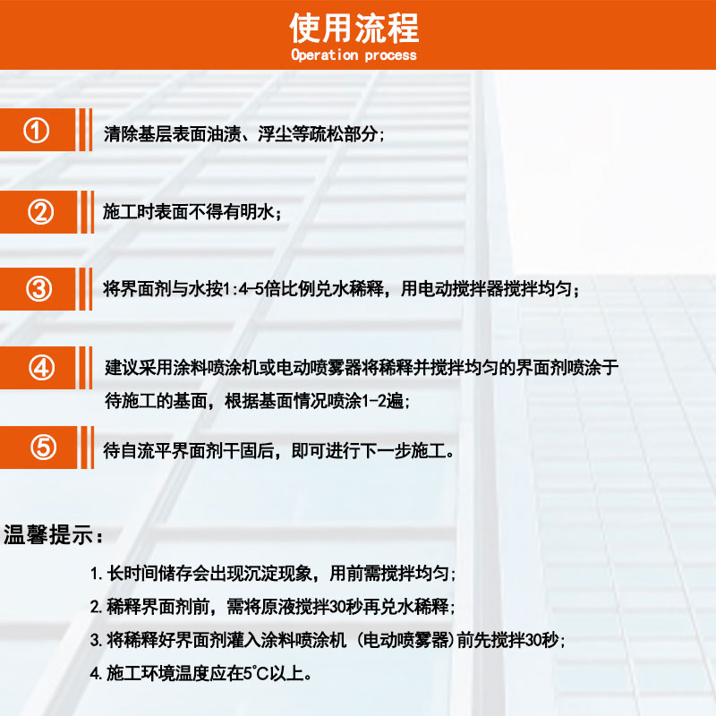 Lors de l’utilisation d’un agent d’interface autonivelant à base de gypse, l’agent d’interface doit être brossé ou pulvérisé sur la couche de base selon le rapport spécifié, puis agité et appliqué. Au cours du processus de construction, une attention particulière doit être portée au contrôle de la température et de l’humidité de la construction pour permettre à l’agent d’interface et au matériau autonivelant d’être entièrement mélangés et durcis.