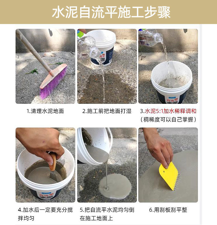 Le ciment autonivelant est un matériau en poudre de type mixte composé d’une variété de matériaux, qui peut être utilisé en mélangeant de l’eau sur place. Après un léger dépliage du grattoir, il est possible d’obtenir une surface de base plane et élevée. La vitesse de durcissement est rapide et peut être piétinée après 24 heures, et les travaux de suivi (tels que le pavage, les panneaux de diamant, etc.) peuvent être poursuivis après 3 jours, car si le sol n’est pas sec et durci. Aller au sol fera gonfler le sol en raison de l’humidité, et la construction est rapide et facile à utiliser, ce qui est incomparable au nivellement manuel traditionnel.