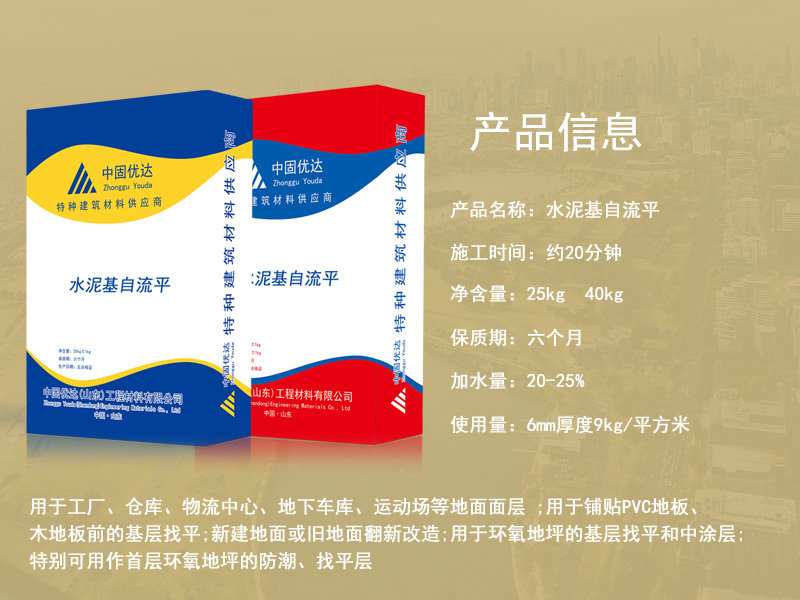 L’autonivelant en ciment convient pour : les installations industrielles, les ateliers, les entrepôts, les magasins commerciaux, les halls d’exposition, les gymnases, les hôpitaux et autres espaces publics, les bureaux, etc., et est également utilisé dans les maisons, les villas, les petits espaces chauds, etc. Il peut être utilisé comme couche de surface de finition ou comme couche de base.