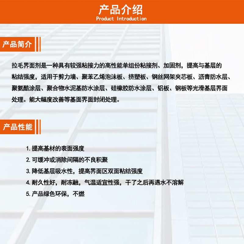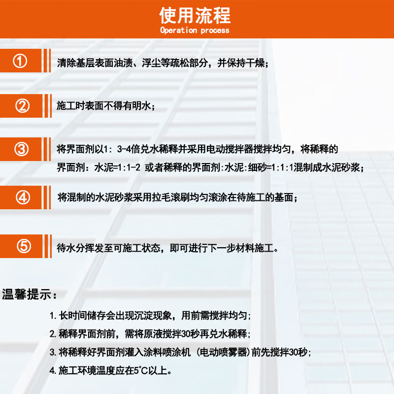 Il convient au prétraitement de l’interface de base du béton, du béton cellulaire, des petits blocs, des cloisons légères, des murs en brique-béton, du grattage de mastic, du collage de carreaux, du revêtement arrière de maçonnerie et des panneaux d’isolation thermique.