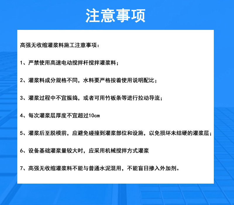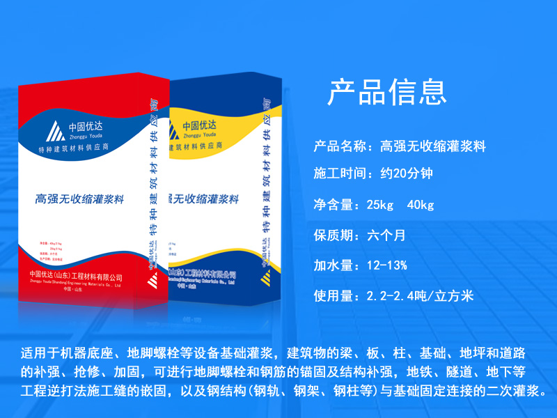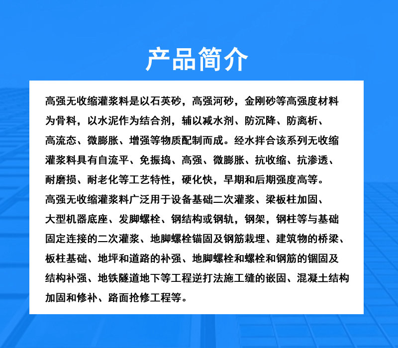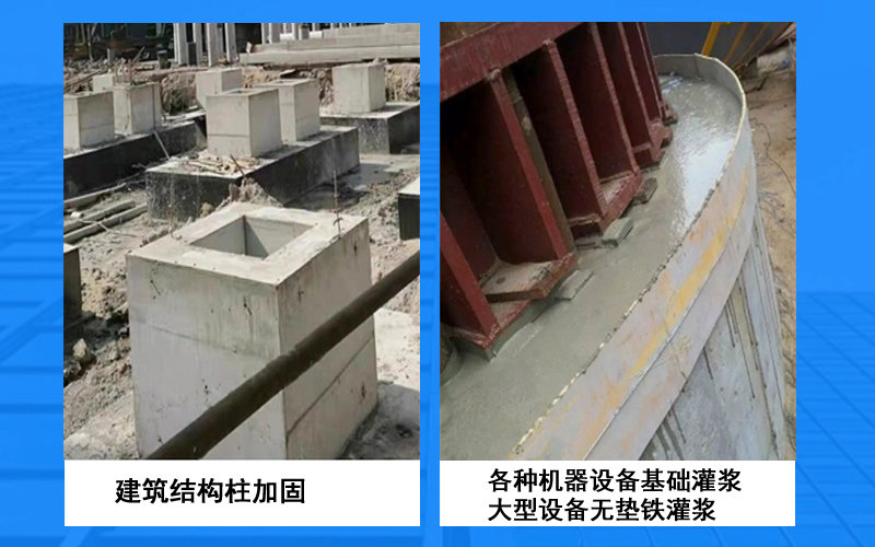 Le coulis sans retrait à haute résistance est principalement utilisé pour : l’ancrage de boulon d’ancrage, la réparation d’urgence de la piste d’avion, la fixation d’équipements d’énergie nucléaire, le renforcement de l’ingénierie des routes et des ponts, le coulis secondaire de la base de la machine, la structure et la fondation en acier, la fondation de l’équipement, la barre d’acier enterrée, le renforcement et la transformation de la structure en béton, le contrôle des fissures de l’ancienne structure en béton, l’installation d’équipements mécaniques et électriques, l’installation de pistes et de structures en acier, le pressage de pieux statiques, l’étanchéité des pieux d’ingénierie, l’épaississement de la structure des murs et la réparation des fuites, divers projets de coulis d’effondrement de l’ingénierie des fondations et divers projets de réparation d’urgence.