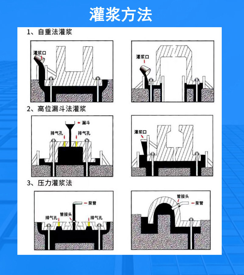 Selon la situation réelle de la base de l’équipement, choisissez la méthode de coulis correspondante, car CGM a une bonne fluidité, dans des circonstances normales, la « méthode de coulis à poids propre peut être utilisée », c’est-à-dire que le coulis est versé directement à partir de la bouche du modèle, et le niveau propre de la boue est entièrement fiable et tout l’espace de coulée est rempli ; Si la zone de remplissage est grande, la structure est complexe ou l’espace est petit et la distance est très éloignée, le « jointoiement par la méthode de l’entonnoir haut » ou le « jointoiement par la méthode de la pression » peut être utilisé pour le jointoiement afin de s’assurer que le coulis peut remplir complètement tous les coins.
