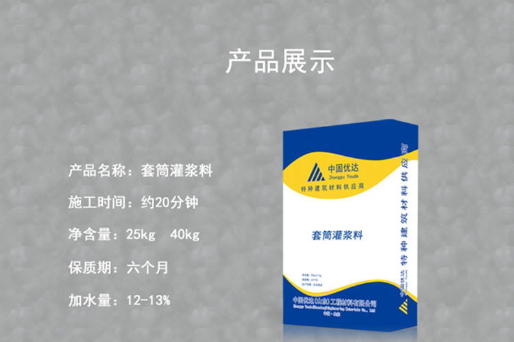 1. L’assemblage par manchon des composants préfabriqués en béton tels que les logements préfabriqués et les logements industrialisés, les colonnes à cadre préfabriquées et les murs de cisaillement avec la fondation ; 2. Coulis secondaire de fondations d’équipements à grande échelle, coulis de boulons de base de colonne de structure en acier de grande hauteur