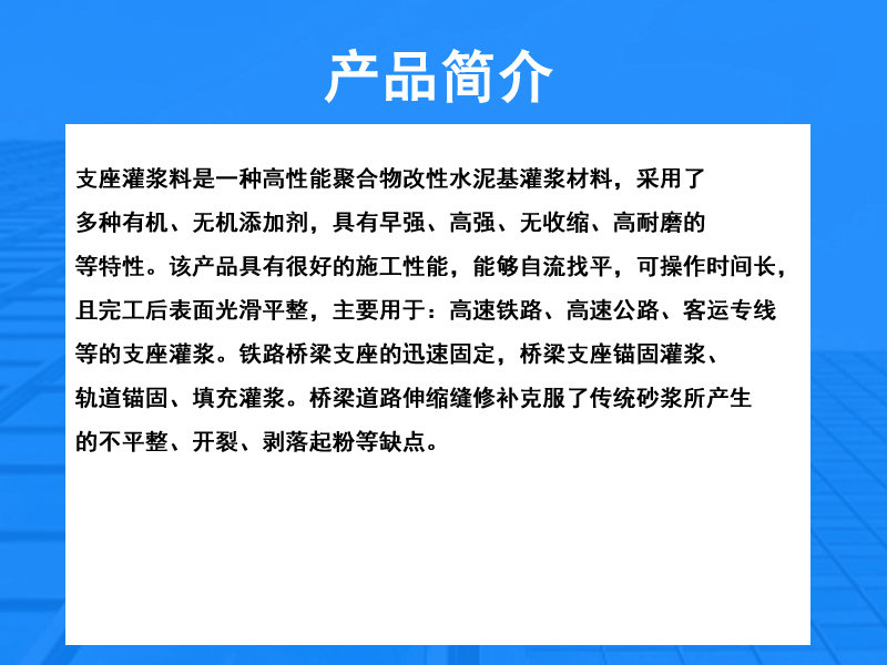 Champ d’application : coulis de soutènement de ponts ferroviaires et de ponts routiers, installation d’appuis en caoutchouc, réparation et remplissage de voies, nivellement local de poutres en béton, renforcement et réparation de piles en béton, coulis d’ancrage d’appuis de ponts, coulis d’ancrages de voies, coulis d’appuis de ponts précontraints, réparation de joints de dilatation d’appuis de ponts, etc.