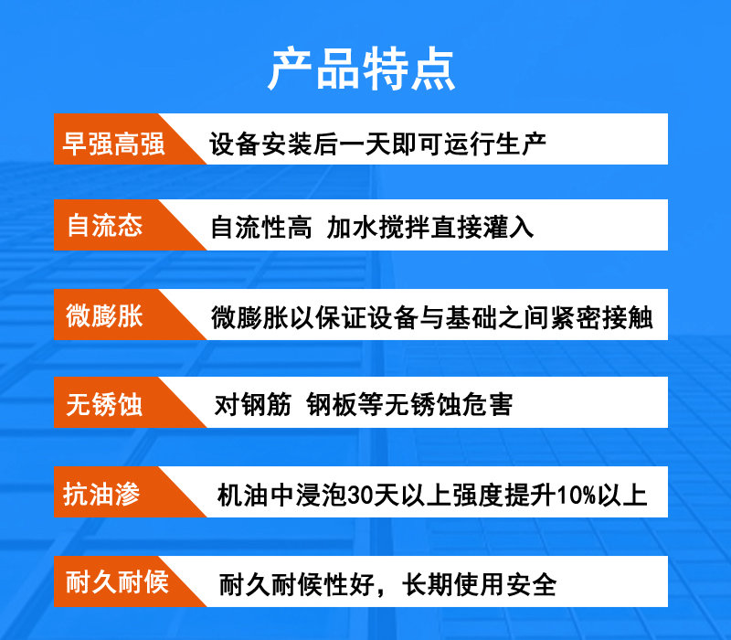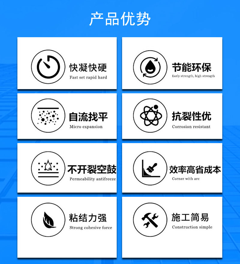 Résistance précoce et haute résistance : 2 ~ 4 heures peuvent atteindre une résistance à la compression supérieure à 20MPa, une résistance à la flexion élevée, une résistance à la compression de 28 jours supérieure à 250MPa, une résistance élevée et aucun retrait.