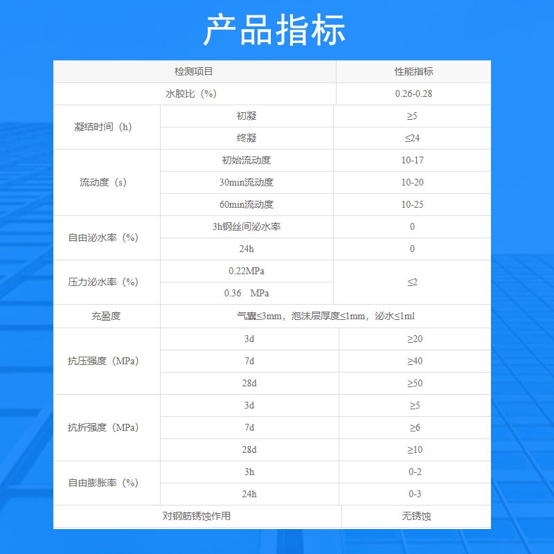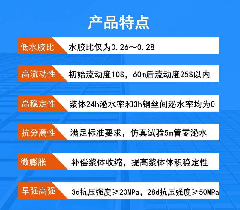 Le coulis est l’abréviation de coulis de tuyaux précontraints (trous), qui est formulé à partir de matériaux à base de ciment de haute qualité, de réducteurs d’eau, de micro-expanseurs et d’adjuvants minéraux, avec une bonne fluidité, pas de saignement, pas de ségrégation, pas de retrait, de micro-expansion, haute résistance, anti-infiltration et antigel, anti-corrosion, haute adhérence, protection de l’environnement vert, etc., et ne contient pas d’oxydes, de chlorures, de sulfites et de nitrites et d’autres composants nocifs pour les barres d’acier, et les produits sont largement utilisés dans la construction de coulis de trous structurels précontraints pour des projets à grande échelle tels que les ponts ferroviaires, les ponts routiers, les centrales nucléaires, etc. Empêcher les fuites de coulis au niveau de divers joints de structure en béton ; Remplir ou réparer les vides ; Jointoiement d’ancrage au sol, coulis de fondation d’équipement, coulis de sol, joints poutre-colonne, réparation d’urgence technique et autres fins.