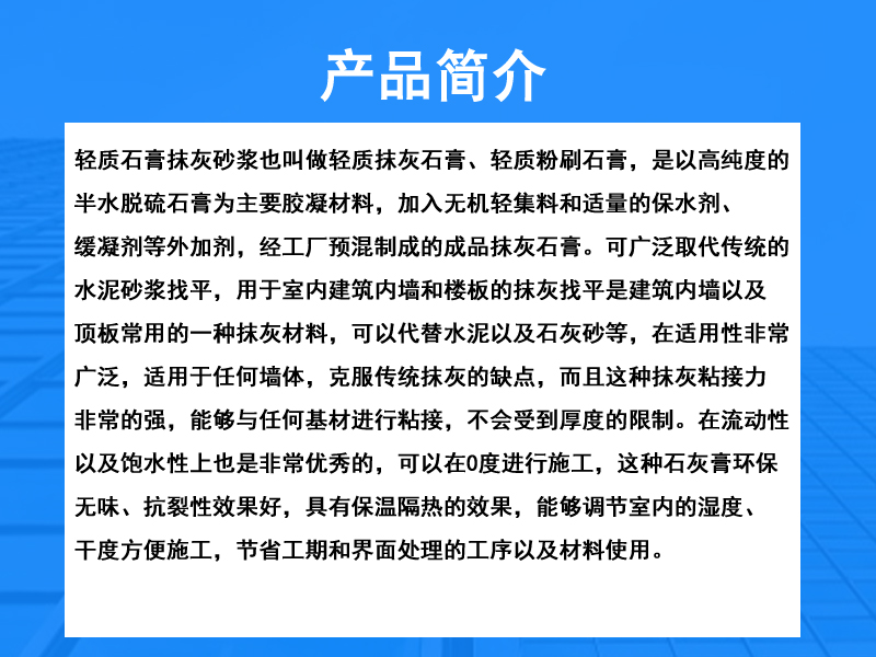 Le mortier de plâtre de gypse léger, également connu sous le nom de gypse de plâtre léger et de gypse de stuc léger, est un gypse de plâtre fini fabriqué à partir de gypse de désulfuration semi-aqueuse de haute pureté comme matériau cimentaire principal, en ajoutant des agrégats légers inorganiques et une quantité appropriée d’agent de rétention d’eau, de retardateur et d’autres adjuvants, et prémélangé par l’usine. Il peut largement remplacer le nivellement traditionnel du mortier de ciment, utilisé pour le nivellement du plâtrage des murs intérieurs et des sols des bâtiments intérieurs est un matériau de plâtrage couramment utilisé dans les murs intérieurs et les toits des bâtiments, qui peut remplacer le ciment et le sable de chaux, etc., dans une large gamme d’applicabilité, adapté à n’importe quel mur, pour surmonter les inconvénients du plâtrage traditionnel, et cette adhérence de plâtrage est très forte, peut être collée avec n’importe quel substrat et ne sera pas limitée par l’épaisseur. Il est également très bon en fluidité et en saturation en eau, et peut être construit à 0 degré, ce type de plâtre à la chaux est respectueux de l’environnement et inodore, a une bonne résistance aux fissures, a l’effet d’une isolation thermique, peut ajuster l’humidité et la sécheresse de la pièce, faciliter la construction et économiser la période de construction et le processus de traitement d’interface et l’utilisation des matériaux.