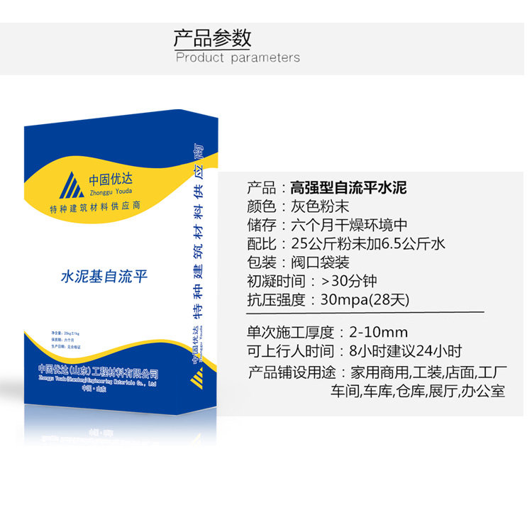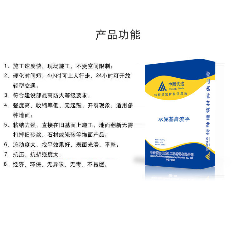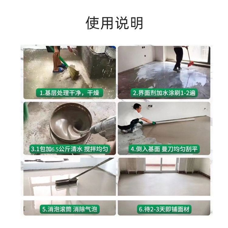 Le ciment autonivelant est un matériau en poudre composé d’une variété de matériaux, qui peut être utilisé en mélangeant de l’eau sur place. Légèrement déplié à l’aide d’un grattoir, il est possible d’obtenir une surface de base très plane. La vitesse de durcissement est rapide, vous pouvez marcher dessus après 24 heures, et vous pouvez continuer à effectuer des travaux de suivi (tels que les sols en pavé, les panneaux de diamant, etc.) après 3 jours, car si le sol n’est pas sec et dur. L’étage supérieur rendra le sol humide et renflé, et la construction est rapide et simple, ce qui est incomparable au nivellement manuel traditionnel.