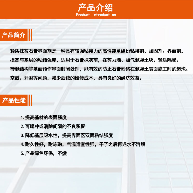 L’agent d’interface de gypse de plâtrage léger est un matériau spécialement conçu pour traiter la surface du plâtre de plâtre léger. Il présente une variété de caractéristiques fonctionnelles, ce qui rend la construction de gypse de plâtre léger plus facile et plus fiable.