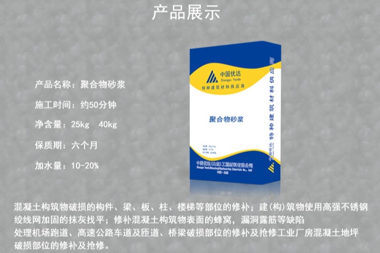 9. Parce que le mortier de réparation à haute résistance contient une variété de matériaux d’extravasation modifiés par des polymères moléculaires et de la poudre de caoutchouc, le mortier de réparation mixte à haute résistance est plus visqueux et le plâtrage doit être maintenu propre et propre.